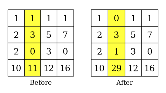 于是我们就可以考虑将每行\列的异或值求出,并添加一个新的列\行来存储,这样就变成了一个 的矩阵,然后每一个操作就变为了交换矩阵中任意两行或列的元素.问题就变成了选择 行 列,求最小的 .